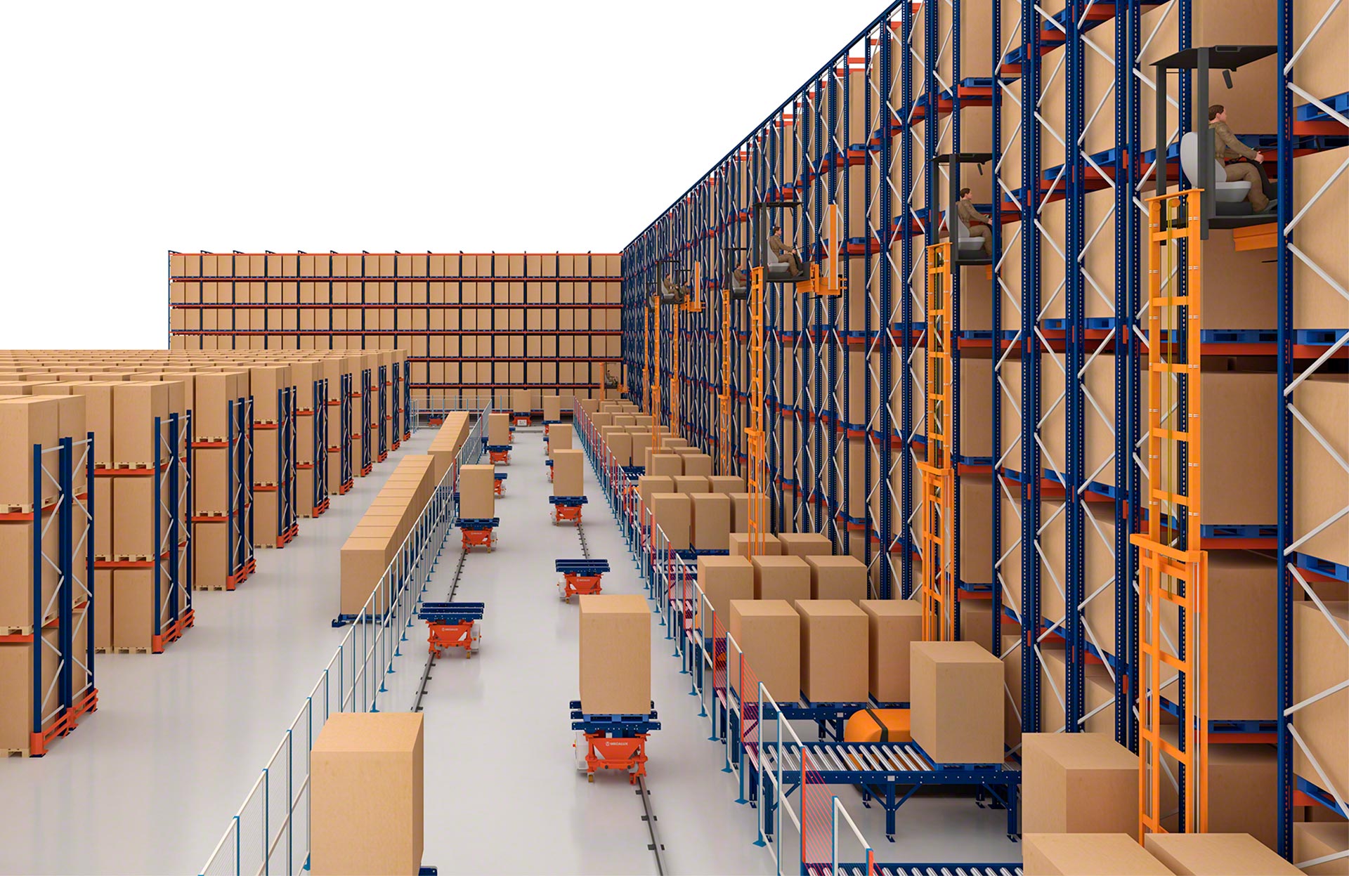 Notranji transportni sistem, ki avtomatizira in racionalizira pretok palet z vozički na lasten pogon, ki se premikajo po elektrificiranih tirnicah.