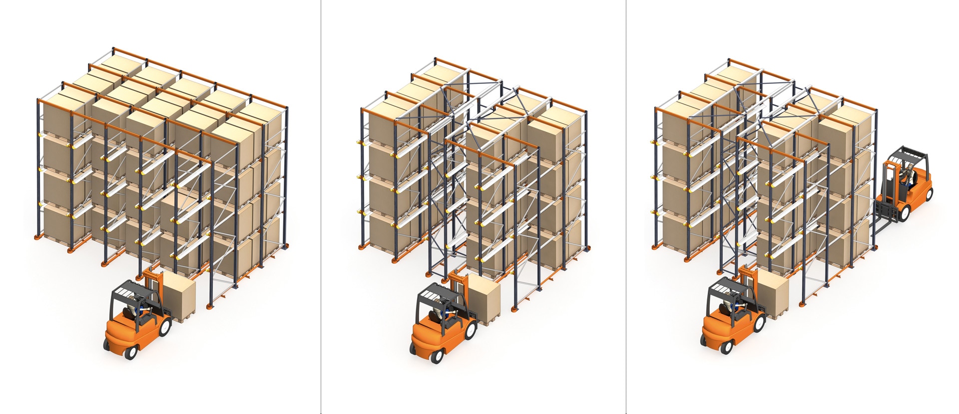 Na voljo sta dva sistema upravljanja: sistem drive-in z le enim dostopnim prehodom in sistem drive-through z dostopom do tovora z obeh strani regala.