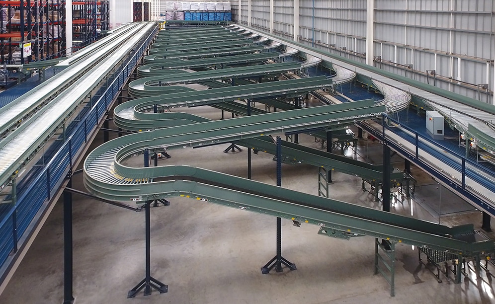 Tekoči trakovi v prvem in drugem nadstropju premikajo škatle do dvigala, medtem ko se transportni trak v tretjem nadstropju poveže z obtokom, ki teče v sortirnik.