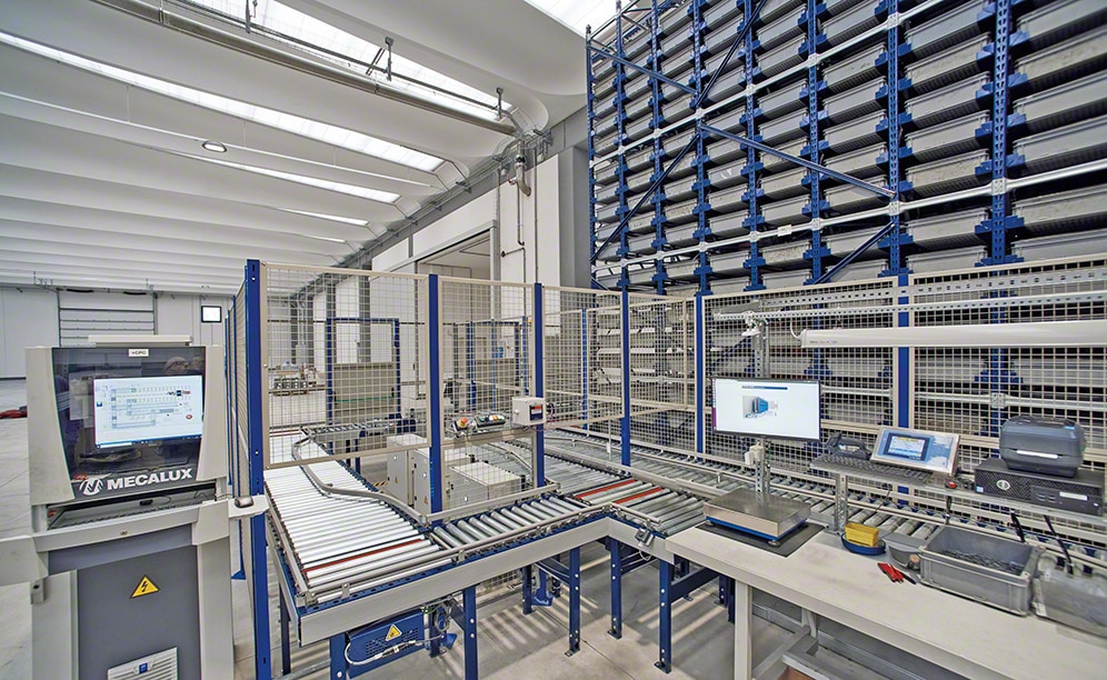 Regalno dvigalo miniload bo upravljalo vhode in izhode blaga. Regalno dvigalo s hitrostjo vožnje 180 m/min lahko izvede do 50 kombiniranih ciklov na uro (25 vhodnih in 25 izhodnih). Vzporedno vključuje dvojni ekstrakcijski sistem, ki omogoča obdelavo dveh škatel hkrati.
