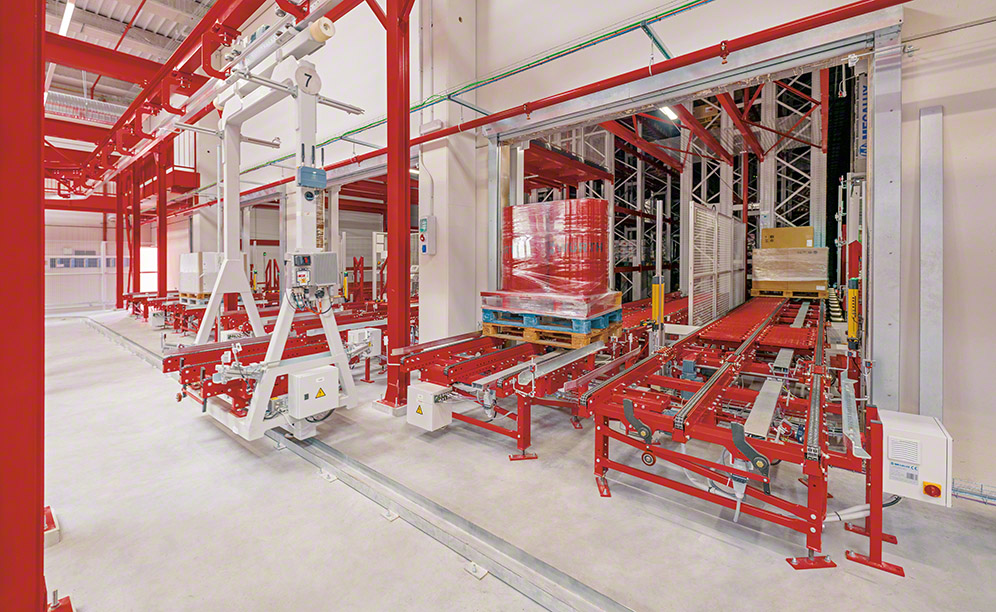 V zgornjem nadstropju elektrificiran enotirni sistem (EMS) prenaša palete v avtomatizirano skladišče do prehoda, ki jim ga je dodelil Easy WMS podjetja Mecalux. Istočasno vozički EMS zbirajo palete, ki gredo v odpremni prostor, in jih premikajo do paletnega dvigala, ki jih spusti v spodnjo etažo.